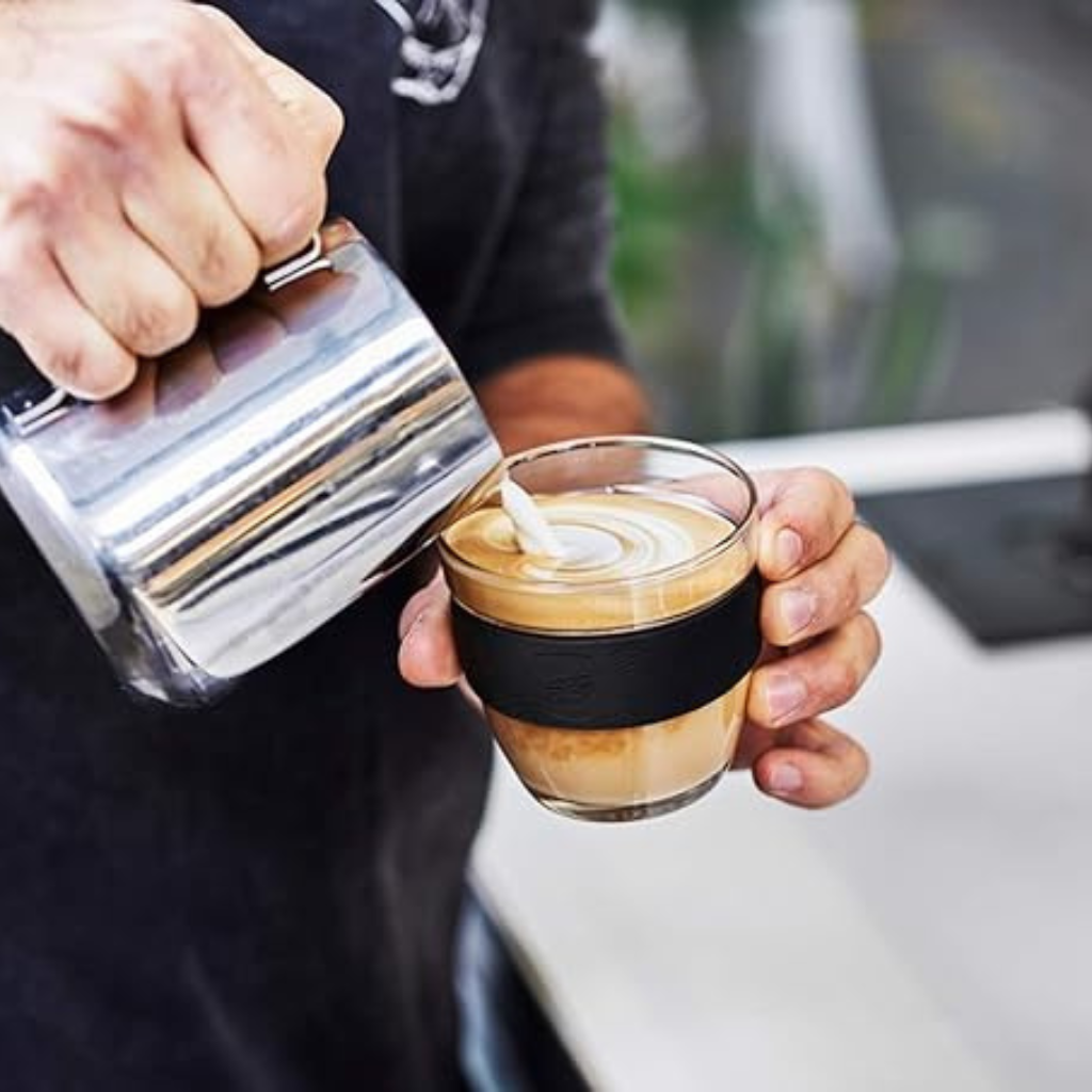 The coffee cup is multifunctional and fits in many holders and espresso machines. The cup is made of glass and the lid is made of BPA-free plastic. The lid has a flap to close or clear the drinking hole.