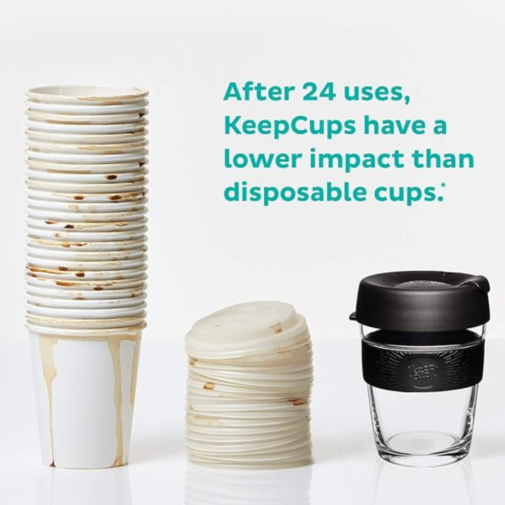 The KeepCup is a sturdy reusable coffee cup with a resealable lid that serves as an alternative to the disposable cup. The lid has a drinking hole that can be closed, which is very useful to prevent spills.