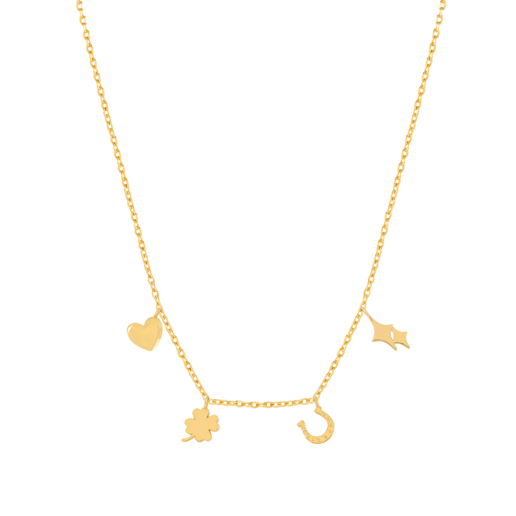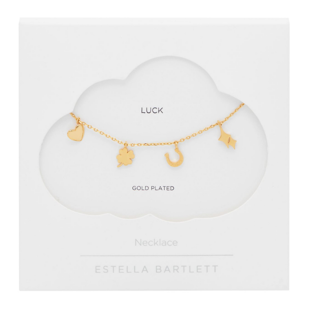 Attract love and luck to your life with this necklace from Estella Barlett. Featuring 4 lucky charms; a love heart, four leaf clover, horseshoe and sparkles for extra magic!