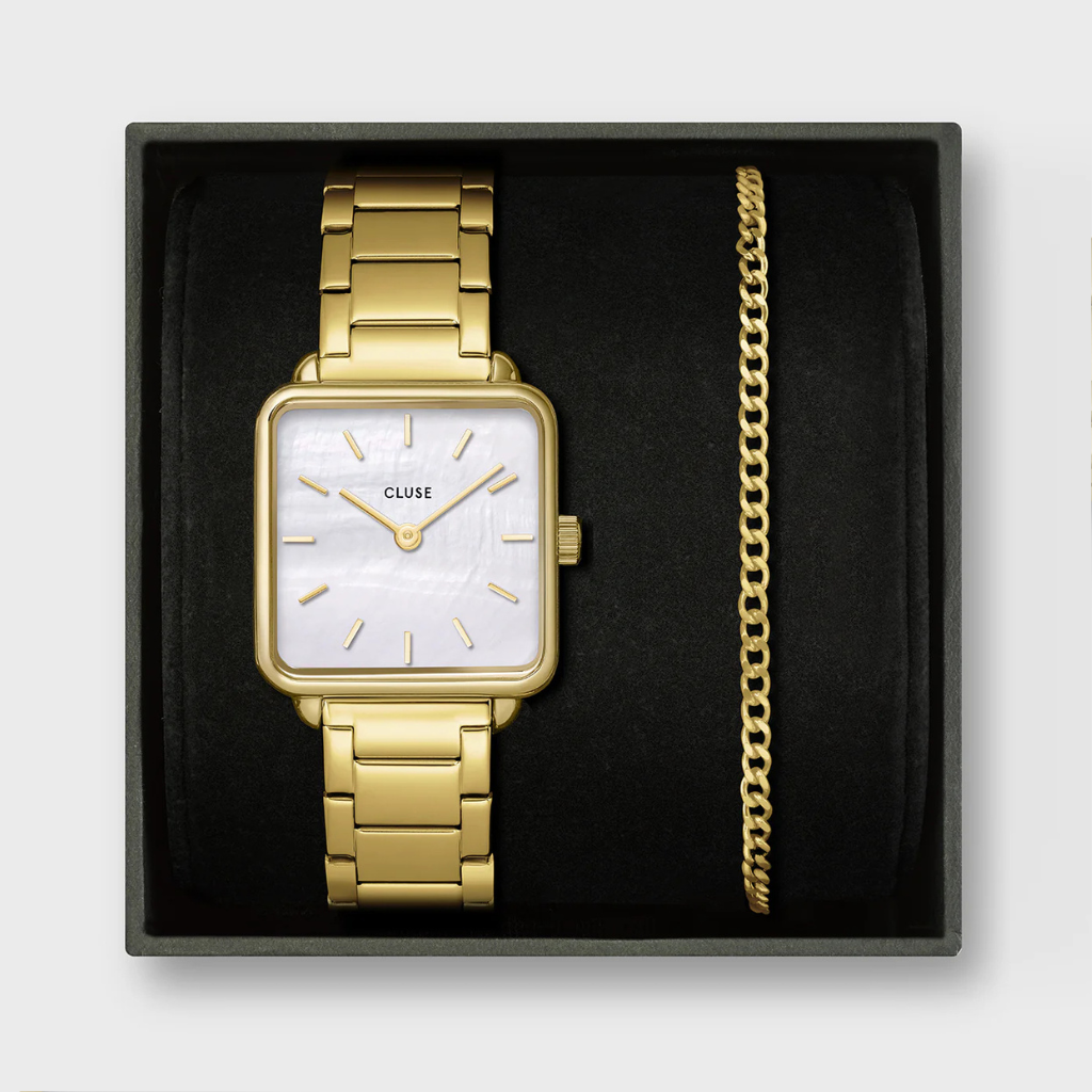 This CLUSE gift box for women combines the La Tétragone women's watch with the gold coloured Curb Chain bracelet. The La Tétragone watch features a white pearl dial, 28.5 mm gold coloured case and 3-link stainless steel strap. Pair the watch with the complementary gold coloured bracelet.