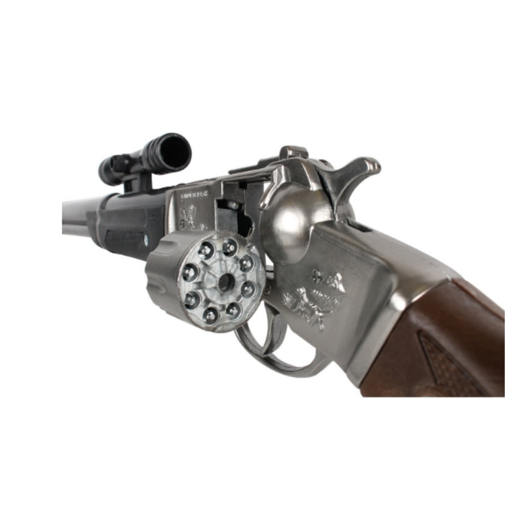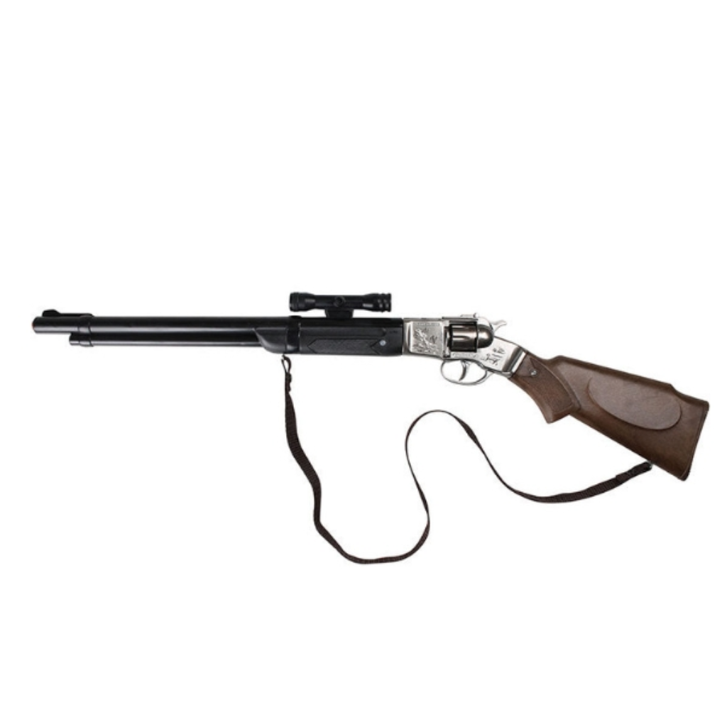 This long plastic rifle is black and brown. It also has a large black shoulder strap. It is about 60 cm long and adapts to the ammunition of 8 firecrackers.