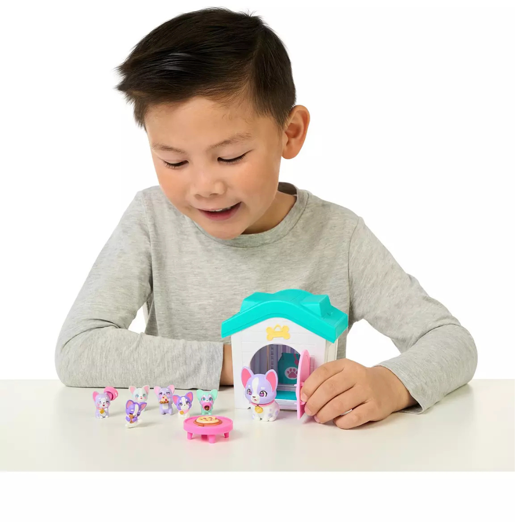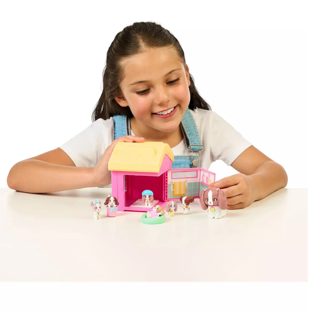 Get Ready To Start Your Family! Let all cuteness begin, and discover a Mama Pup and a baby, ready to welcome new members into the family. Attach the door to the house, and help Mama get ready by wiping her cheeks with water. Her cheeks will turn rosy, then she is ready to reveal more babies!