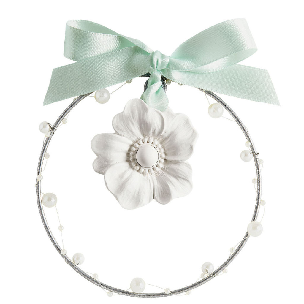 Bring a silver touch to your decoration with this magnificent Fête Nacrée pearl wreath adorned with a delicate scented plaster flower.  Hang it on your walls or hang it on a doorknob.
