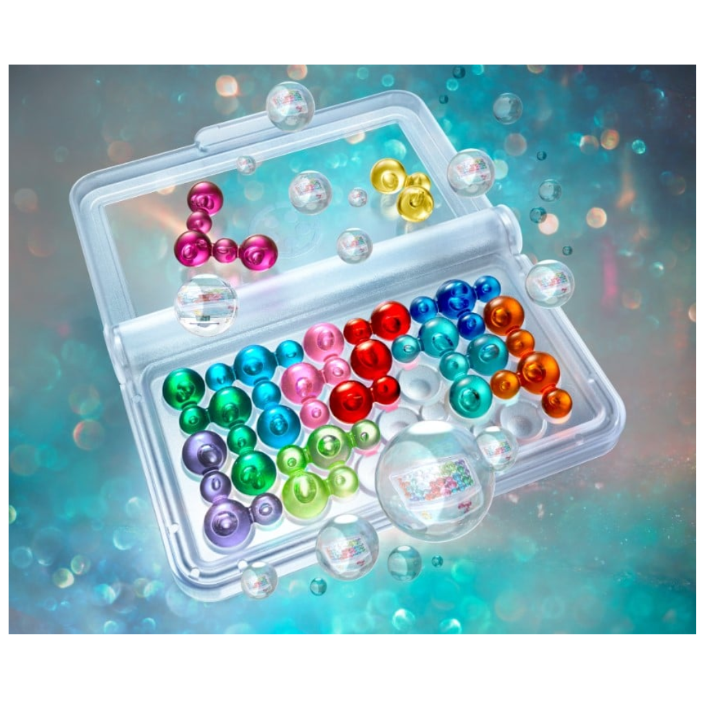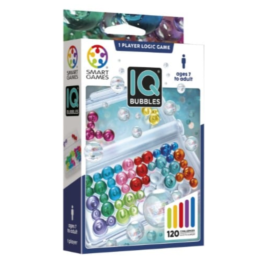 Test your brainpower with IQ Bubbles! This addictive puzzle game challenges players to fit all the colourful, transparent bubble pieces onto the travel-friendly gameboard/case.