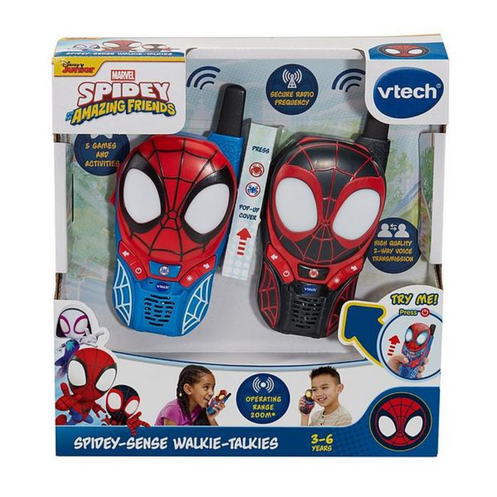 Come in, Spidey fans, over! It's the Spidey-Sense Walkie-Talkies by VTech! Keep in touch indoors and out, at home or on the go, with real walkie-talkie communication! These child-safe two-way walkie-talkies keep your child's conversations encrypted and secure, preventing other walkie-talkie users from listening in on their secret Spidey mission conversations! Enjoy chatting, messaging and gaming with safe walkie-talkie communication up to 500ft/200m in range! Suitable for ages 3-6 years.
