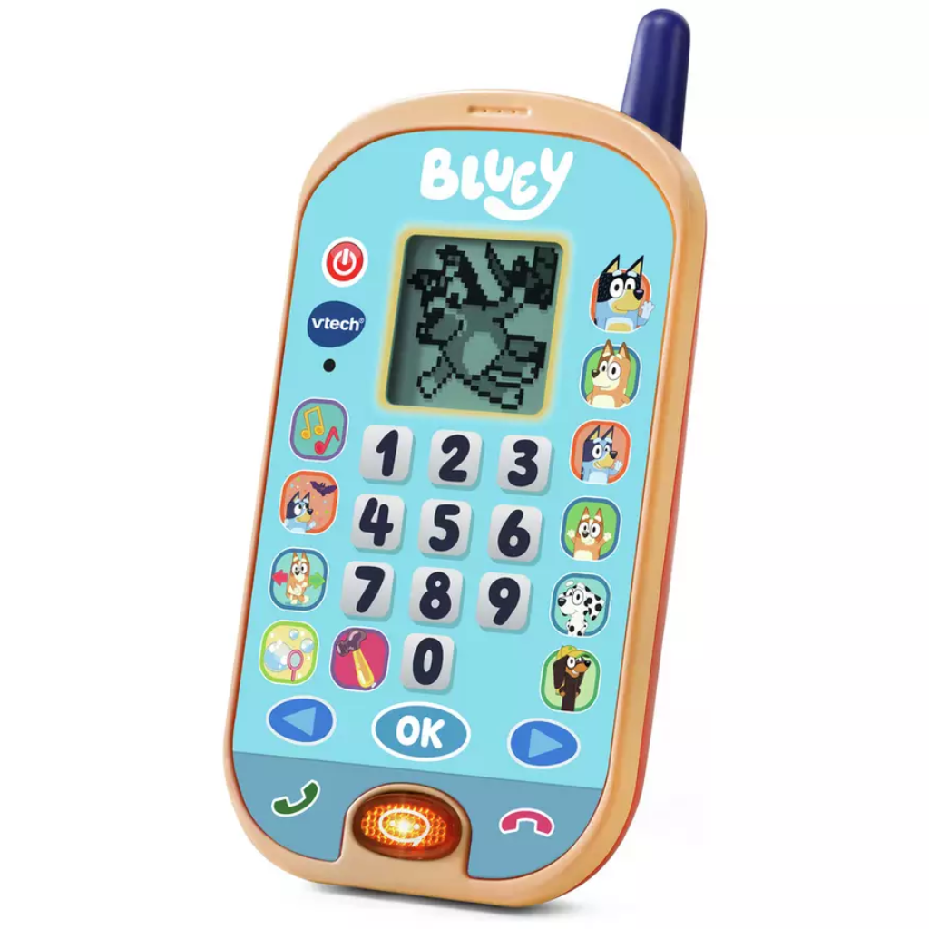 Let's play and chat with Bluey and Bingo while watching animations on screen. Press the character buttons to hear fun phrases about each one. Voice activation lets children chat with Bluey and Bingo for interactive pretend play. Change the ringtone, brightness and more, just like on a real phone. Play four games that feature themes from different series episodes: Use the arrow buttons to help Bingo do a handstand. Or help Bluey blow bubbles by blowing into the microphone.