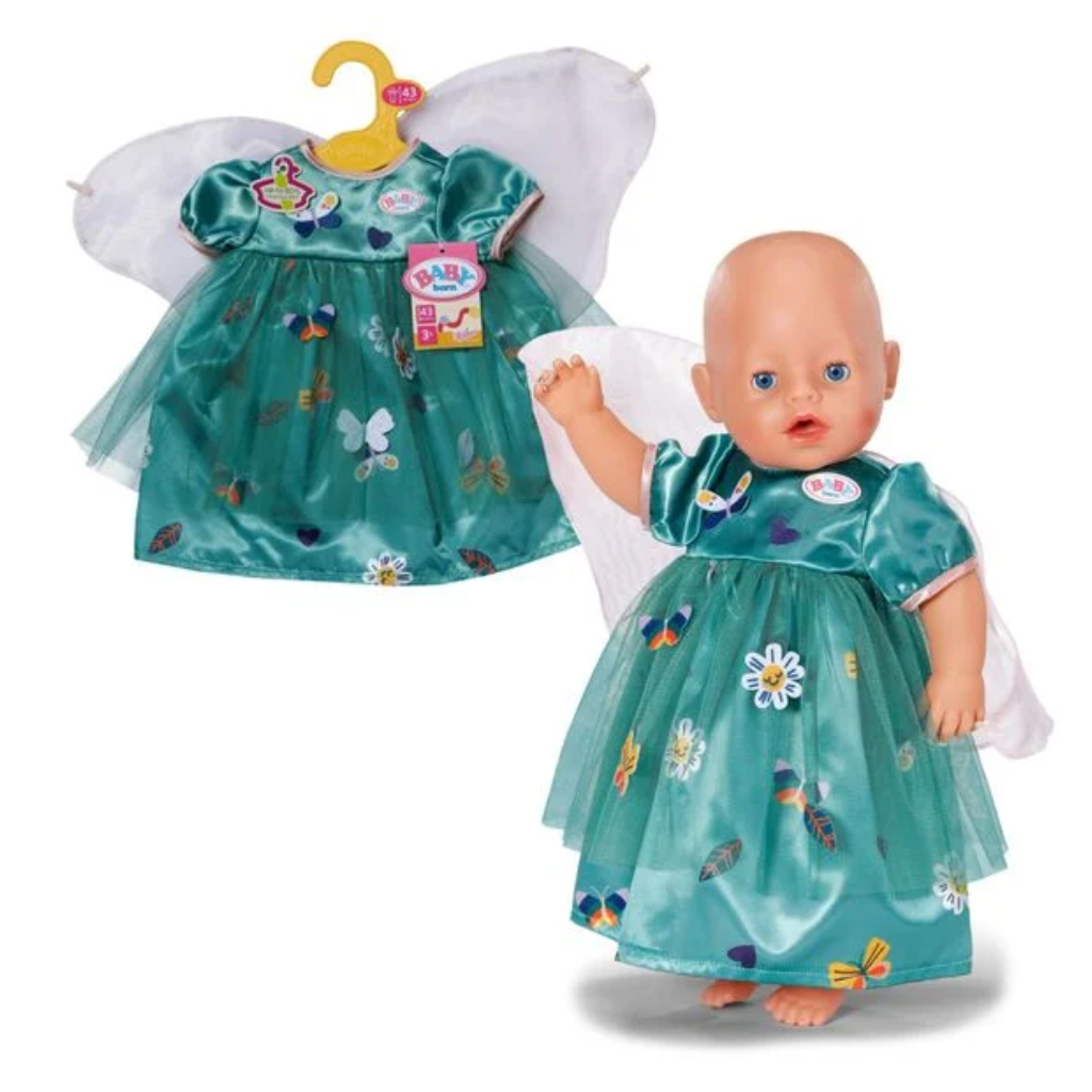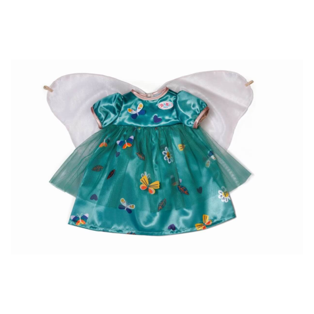 In this romantic forest green dress with tulle details and woodland motifs, BABY born transforms into a forest fairy – who, of course, must also fly: The little wings on the dress, which are attached to the doll's arms, make it possible. Thus, she flies in her imagination through the fairy realm together with the butterflies on the tulle skirt of the dress.