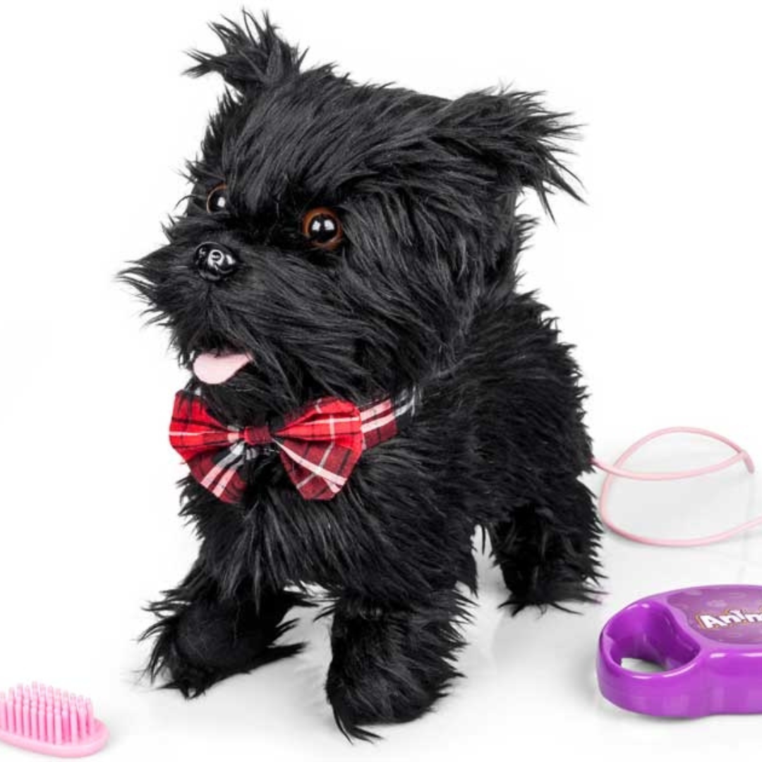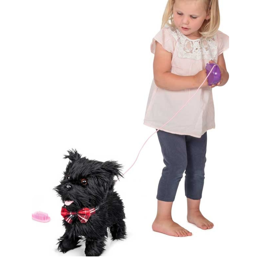 Following on from our incredibly popular Walking Westie line, the Scurrying Scotty is very similar but features a black coat of fur and stylish tartan bow tie. This Scottish terrier comes with a lead that features two buttons, one that makes it walk forward and another that triggers its bark action. Young children looking for an interactive friend will be instantly won over by its charms, whereas adults looking for toys and presents will see the Scurrying Scotty as a clear winner. Part of the Animigos range.