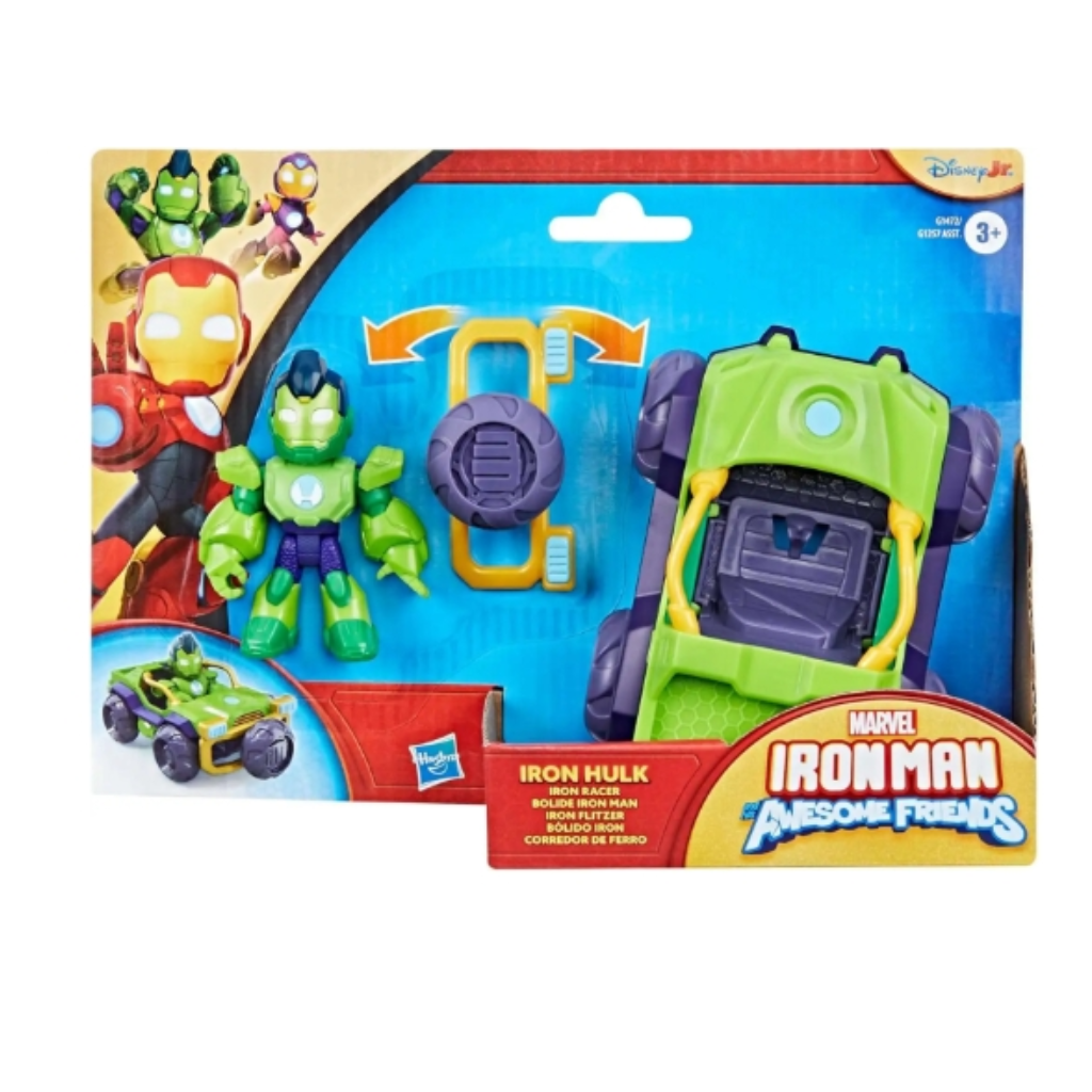 Join Team Iron Man on the latest adventures with this Iron Hulk Iron Racer figure and car 2-pack! This 7.6-cm (3 inch) vehicle toy comes with a poseable Iron Hulk that fits inside. Imagine speeding into action to save the day or remove the detachable 2-in-1 spoiler accessory from the vehicle, attach it to the figure's back to armour up and pretend to smash into adventure. Encourage big, imaginative, adventure play for children ages 3 and up with these Marvel toys for boys and girls! Keep an eye out for even more Iron Man and His Awesome Friends toys, to build a Super Hero collection or give as cool Marvel presents for preschool children! (Each sold separately. Subject to availability.) Copyright MARVEL. All trademarks and registered trademarks are the property of their respective owners. HASBRO and all related trademarks and logos are trademarks of Hasbro, Inc.