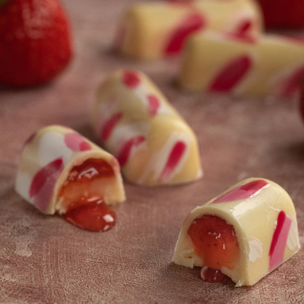 Immerse yourself in the indulgence of our salted caramel, where the sweetness of caramel is perfectly complemented by the delicate Achill Island sea salt. Let the tangy sweetness of strawberries become a, smooth, silky ganache.