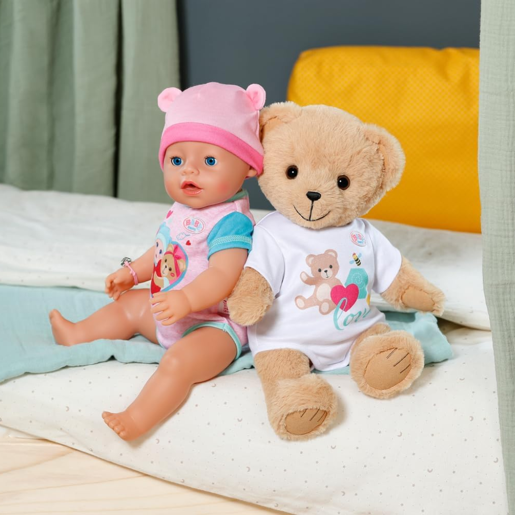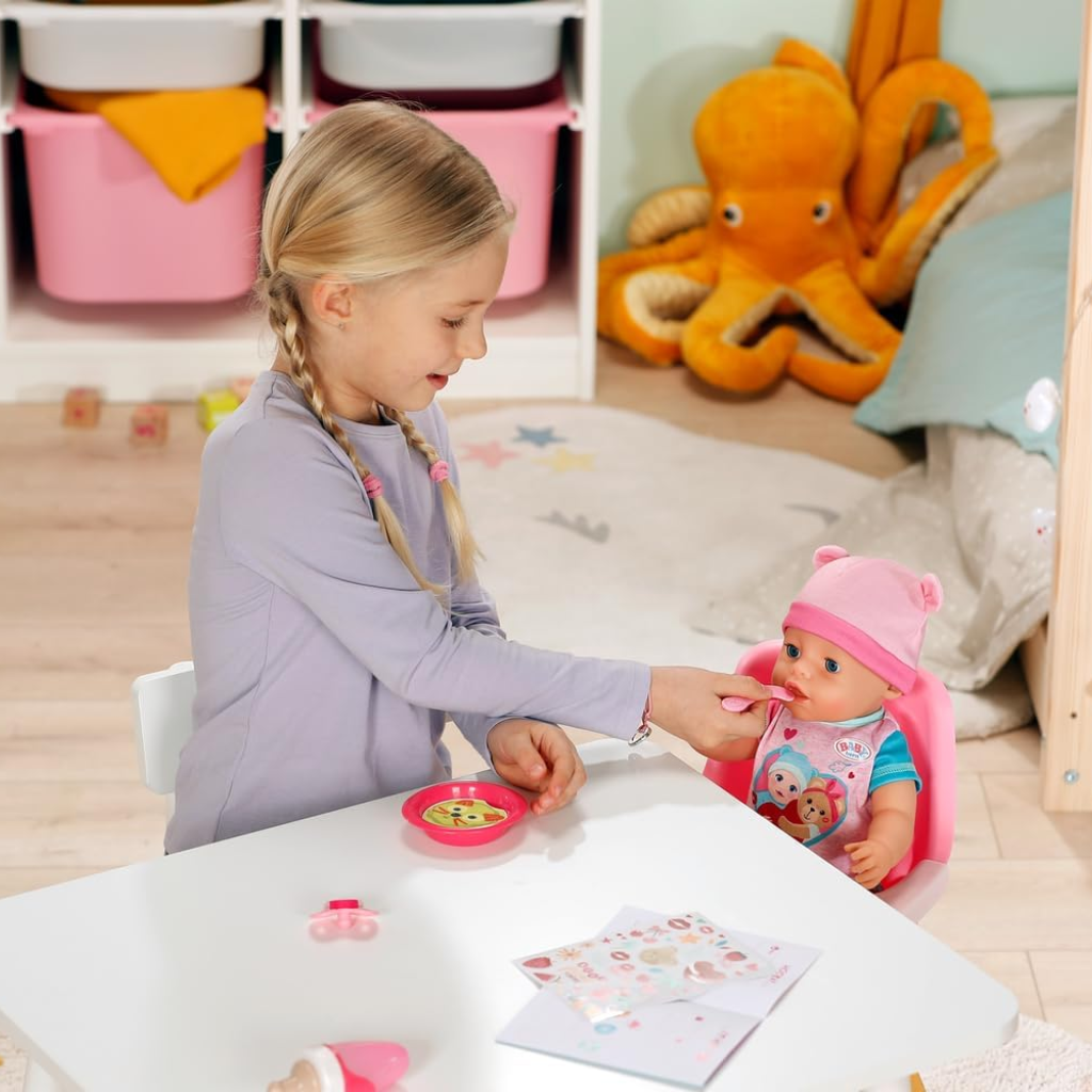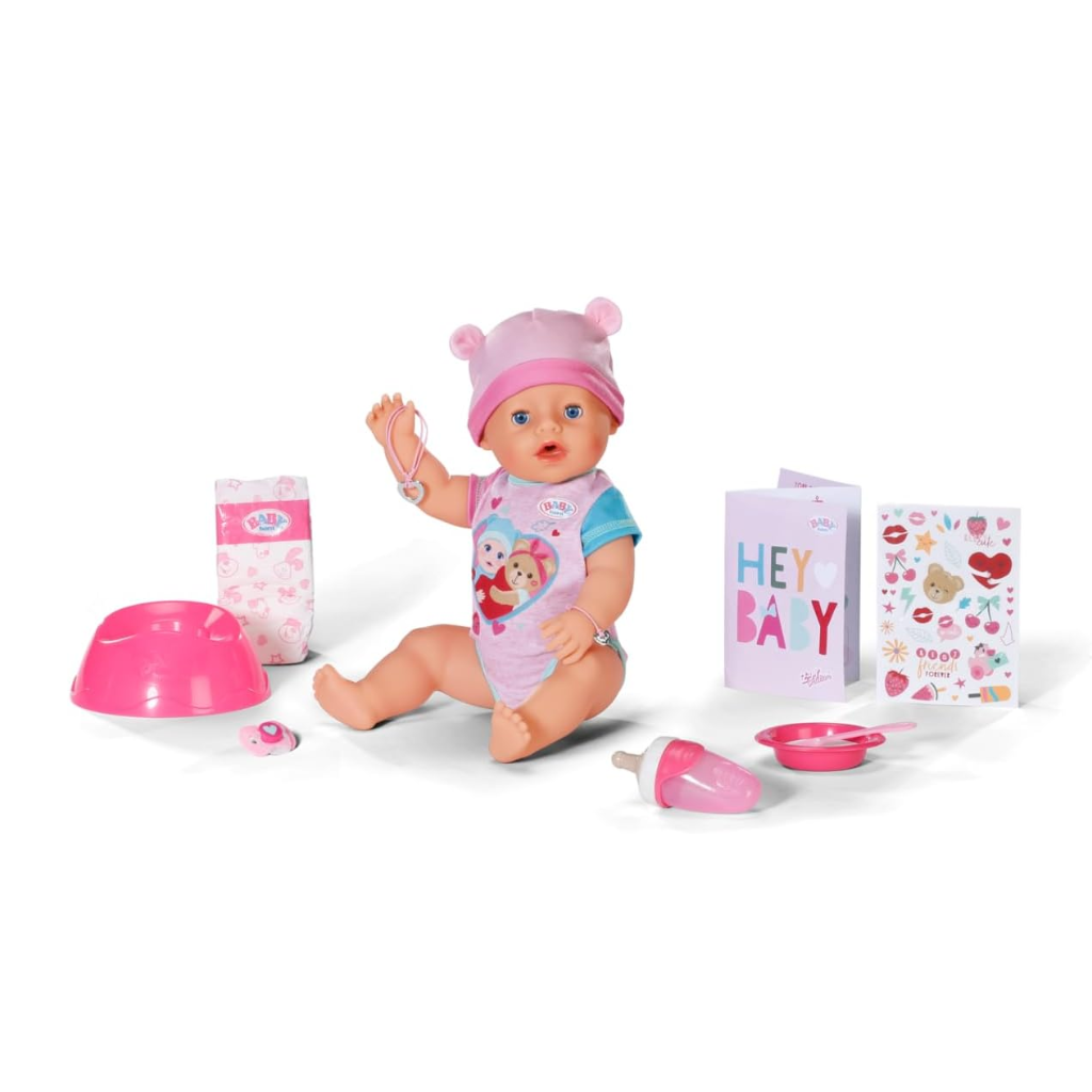 - Box contents: BABY Born Emma 43 cm including romper, hat, potty (water magic), nappy, plate (feeding magic), spoon, bottle, magic dummy, birth pass, friendship bracelets for child and doll