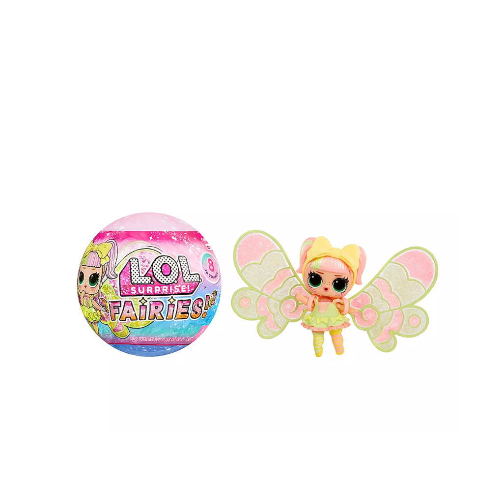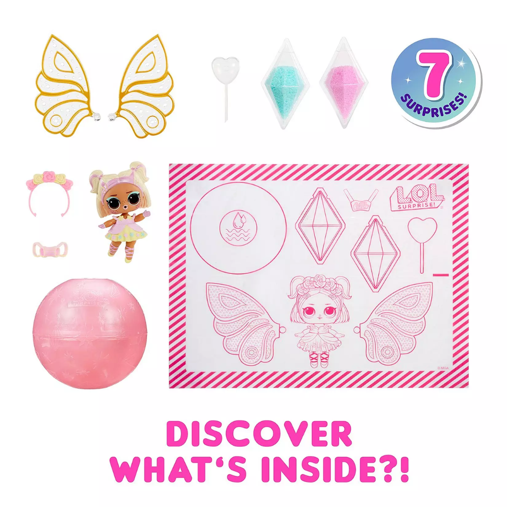 L.O.L. Surprise! brings you a Fairies theme for the first time ever, along with an all-new play pattern to customize and make your own fairy wings for your dolls! Includes a doll, a pair of fairy wings, 2 colours of fairy crystals mix, a pipette, fashions, and accessories. Plus, the ball packaging doubles as a display stand for your L.O.L. Surprise! Fairies Tots to show off your customized fairy wings! Discover Whats Inside!