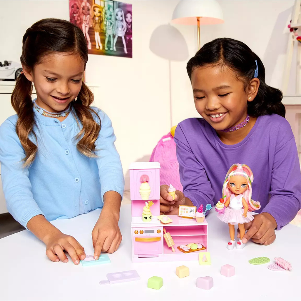 The Rainbow High Littles Dessert shop playset includes exclusive doll, Kandy, and all the accessories to make her the best sweet treats. Kandy, the exclusive 5.5" doll, is the little sister of Kia Hart and has her own unique style. The playset comes with exclusive doll, Kandy, in fabulous fashion, 4 dough colours, 2 pastry mould sheets, 1 baking sheet, 2 spoons, 1 sorbet cup, 1 cupcake cup, 1 cone, 1 ice cream cup, 2 rolling pins, 1 horn, 1 cherry, and 2 cookie cutters. Kia Hart doll not included.
