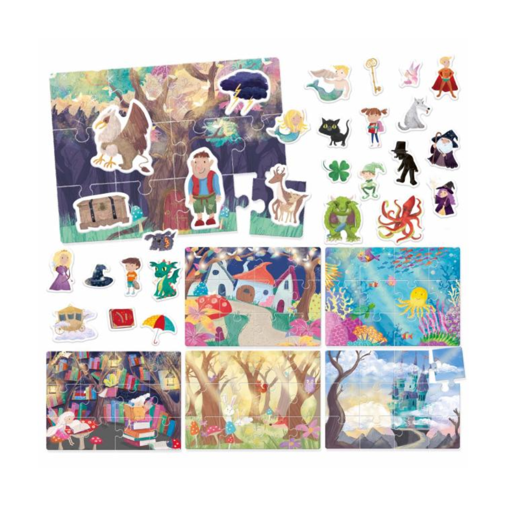 A delightful set of 6 puzzles, beautifully detailed with a fantasy settings. A wonderful way to encourage imagination, conversation and creativity. Build any of the 12-piece jigsaw puzzles, and use the 29 cut-out characters to bring magical tales to life.
