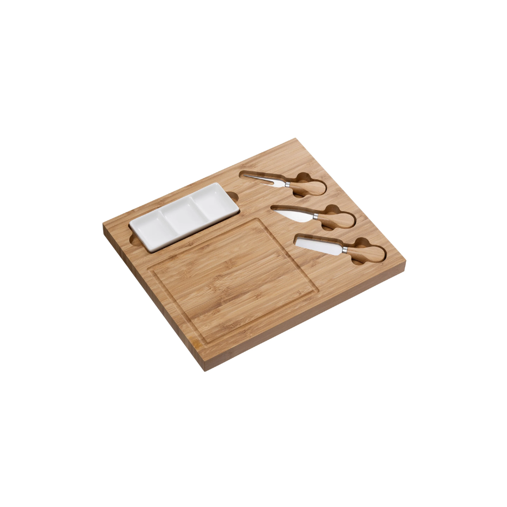 BELLEEK LIVING new Cheese Board and Knife set is ideal for entertaining. Impress your guests with a beautifully displayed snack board. The board is crafted from bamboo wood and comes complete with knife set and divided dish.