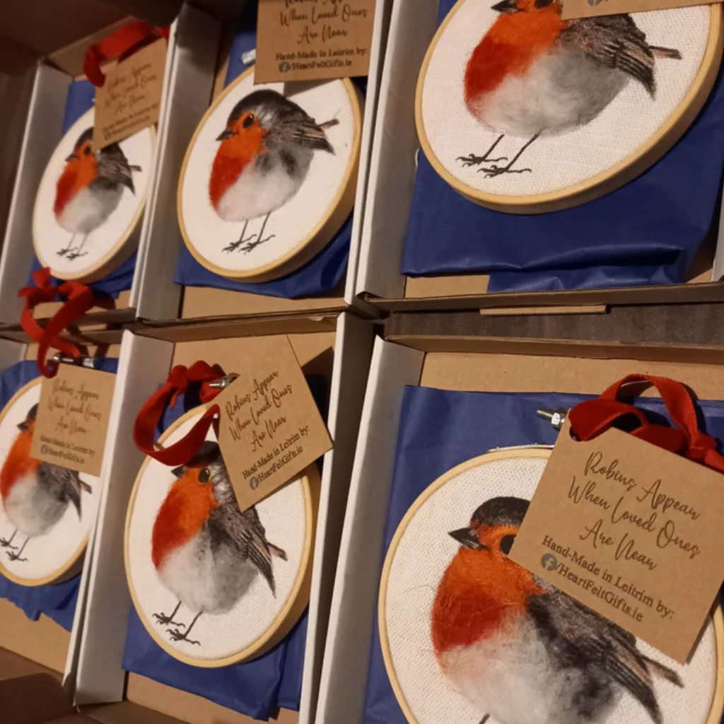 These Hand made Robins are a perfect "Thinking of you" Gift, and also are an ideal sympathy gift. These hand made Robins are carefully made by needle felting wool into linen and framing them in a 4" embroidery hoop, threading a special tag on with high quality red velvet ribbon and finally gift-wrapped for presentation as a gift to someone special.