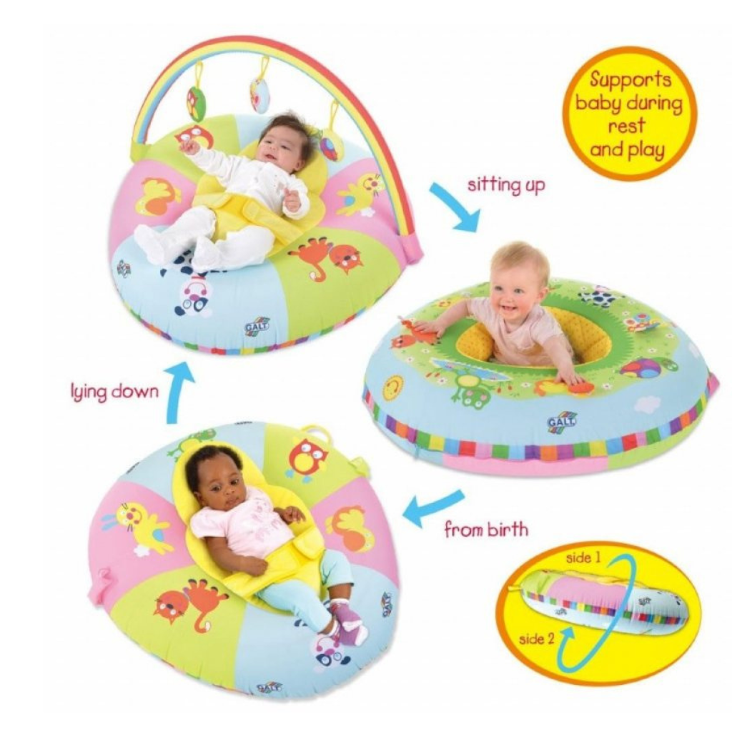 This comfortable, double-sided play nest with a soft rainbow bow is ideal for supporting your baby while resting or playing. One side of the Spielnestes is a soft resting place for comfortable lying. The harness keeps your baby's auction in the inflatable ring. The rainbow arch with colorful toys stands out for its bright colors and patterns. When your little boy gets older, all you have to do is turn the nest around. The padded seat then supports your baby in a sitting position. There are eight multisensory game features to stimulate touch, sight and hearing.