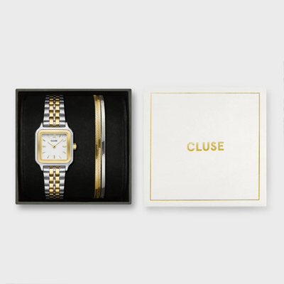 Gift Box La Tétragone Watch Steel, White Pearl & Curb Chain Bracelet, Gold Colour