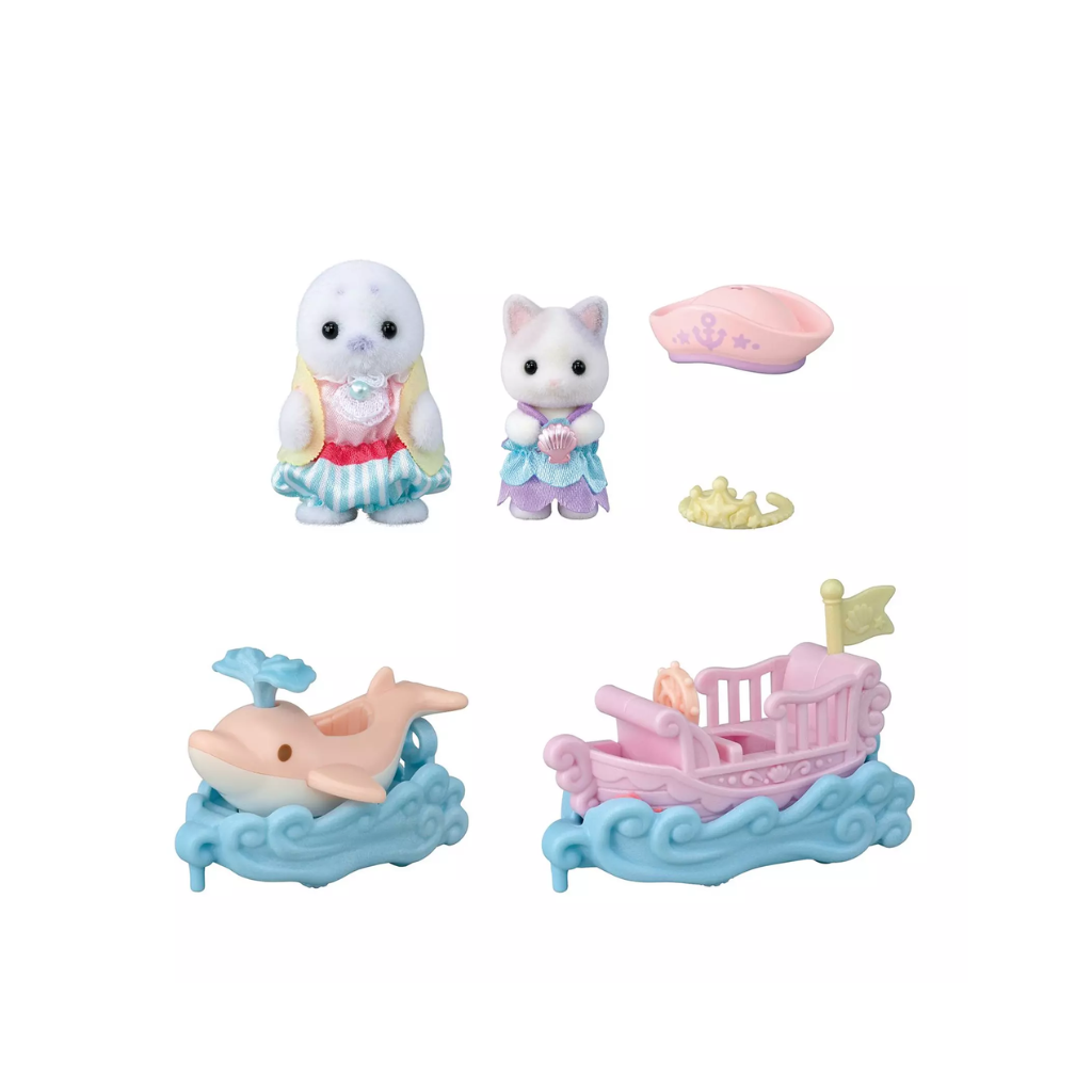 A set of amusement park rides with cute features, along with the Seal baby and Latte Cat cradled baby. The boat sways back and forth as it moves. The water from the dolphin's head moves up and down. The babies are wearing cute outfits that match each ride. The boat and dolphin can be connected.