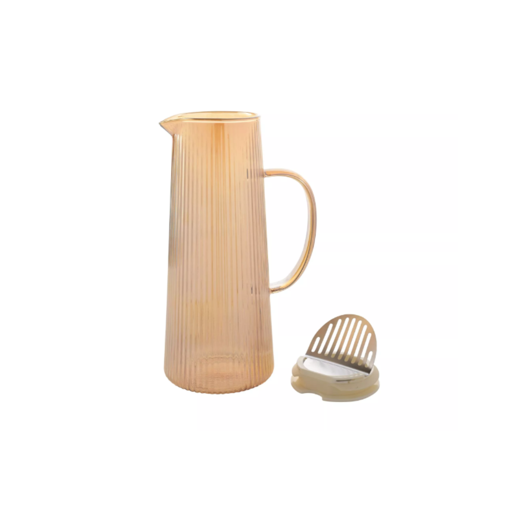 Bring a touch of elegance to the dining table with the Hestia Ribbed Glass Jug. Subtle vertical ribbing and a delicate handle add graceful flair to this champagne-coloured jug, perfect for serving water, juice or wine. The shapely silhouette and gleaming glass lend a refined, yet effortlessly chic look to any occasion. Made from durable glass in a stunning champagne hue, this jug makes a sophisticated statement. An essential component for elegant entertaining.