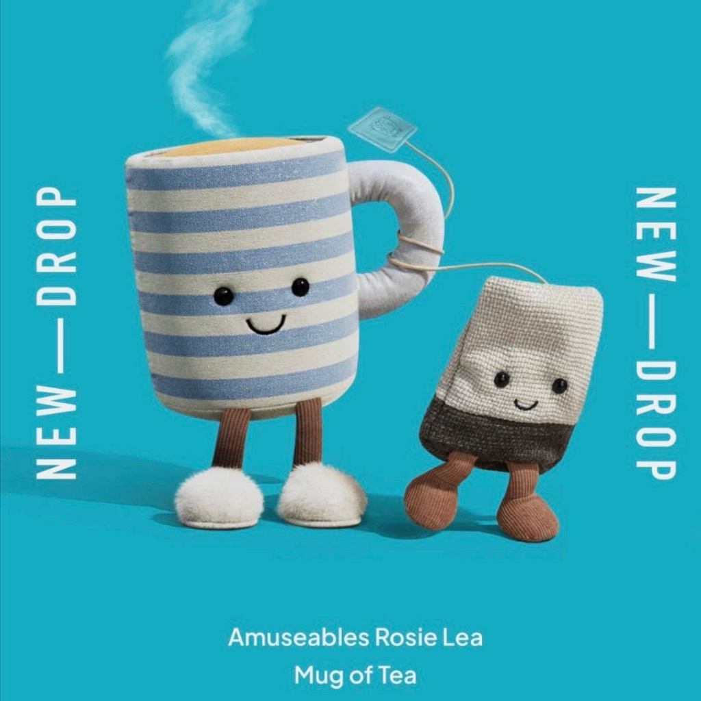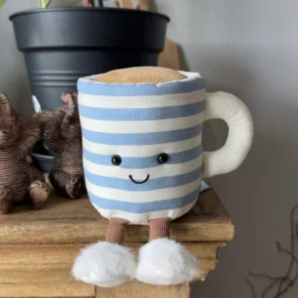 Exclusive New Jellycat, Rosie Lea Mug of Tea! The perfect companion for your Jellycat Teabag, with blue and white stripes, an embroidered face, small brown velvet legs and plush white sock boots. Perfect to cozy up your space!